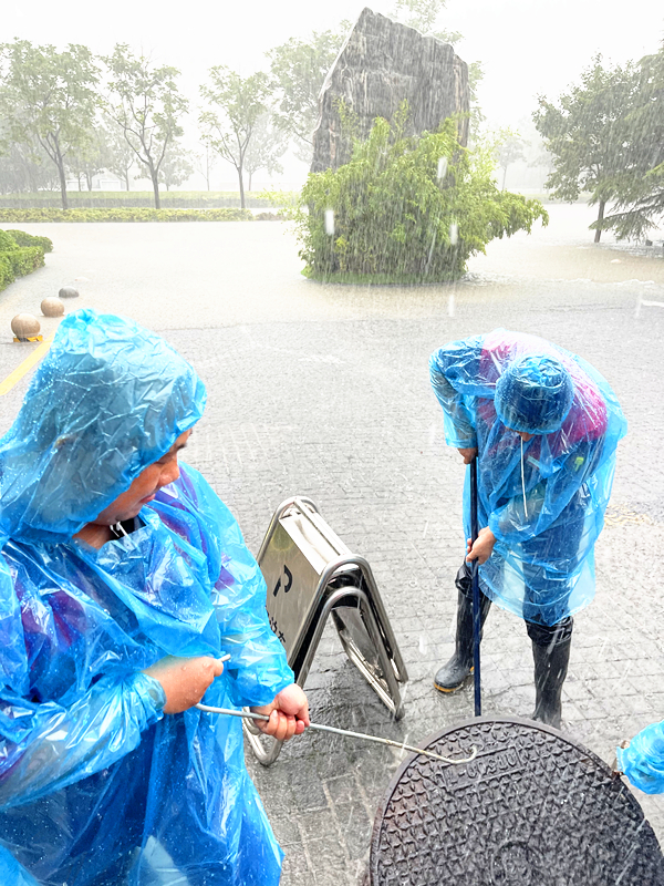 在雨水絲毫不減,越下越急的危機時刻,工程部師傅們毅然踏入水中,一點一點清理被堵的排水口,盡全力保障業(yè)主家園安全。平均年齡比其他各部門都高的環(huán)境部工作人員,絲毫沒拖任何后腿,全力向前,爭分奪秒地不間斷補位吸水排污,順利完成美盛中心地下三層車庫無積水出現(xiàn)任務(wù)。